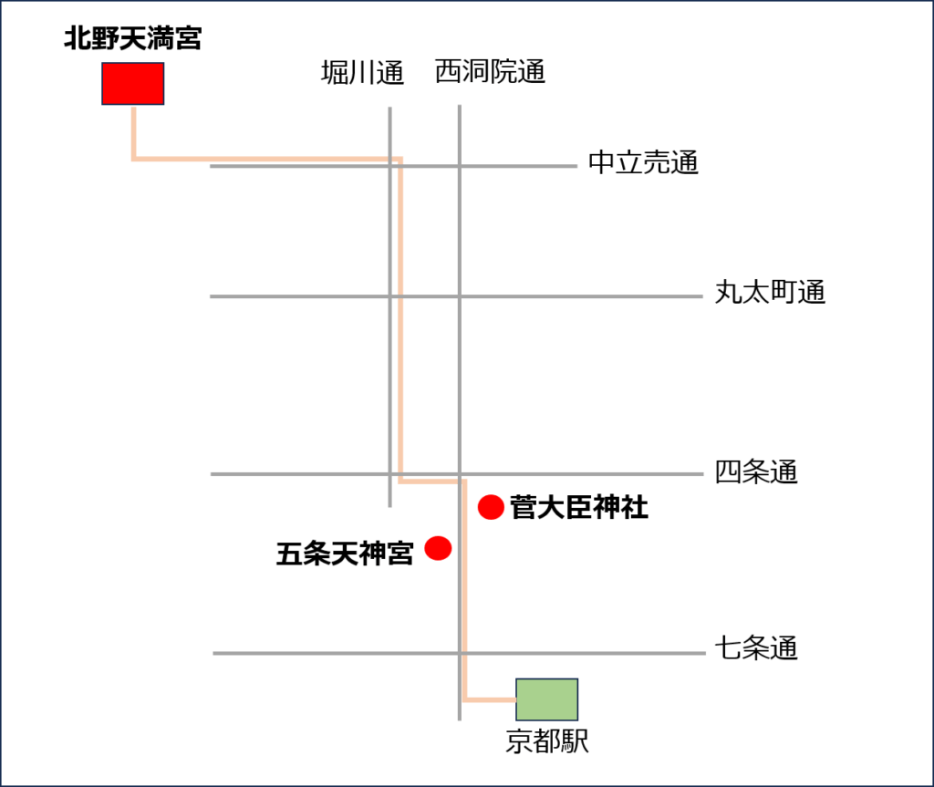 つぐ子「菅大臣神社と五条天神宮は西洞院通の五条から四条までの間にあります。京都駅から出発した北野線が最初に横切るのは五条天神宮です」